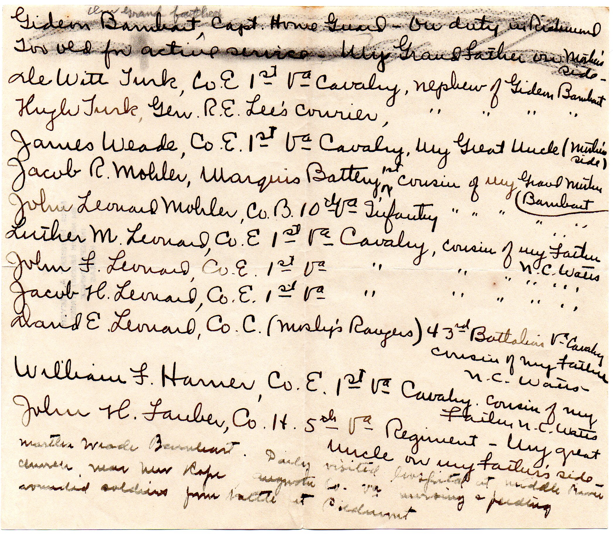 1865 Geneology information re Confederate soldiers LWG writing at bottom of paper